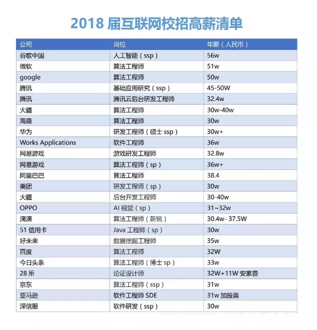 近期, 一张“2018届互联网校招高薪清单”在网络上流传,据清单显示,算法工程师岗位最吃香,不仅企业需求量大并且年薪均是30万起步;除此之外,令人瞩目的一点是谷歌中国对人工智能岗位十分重视,开出56万的起步年薪。